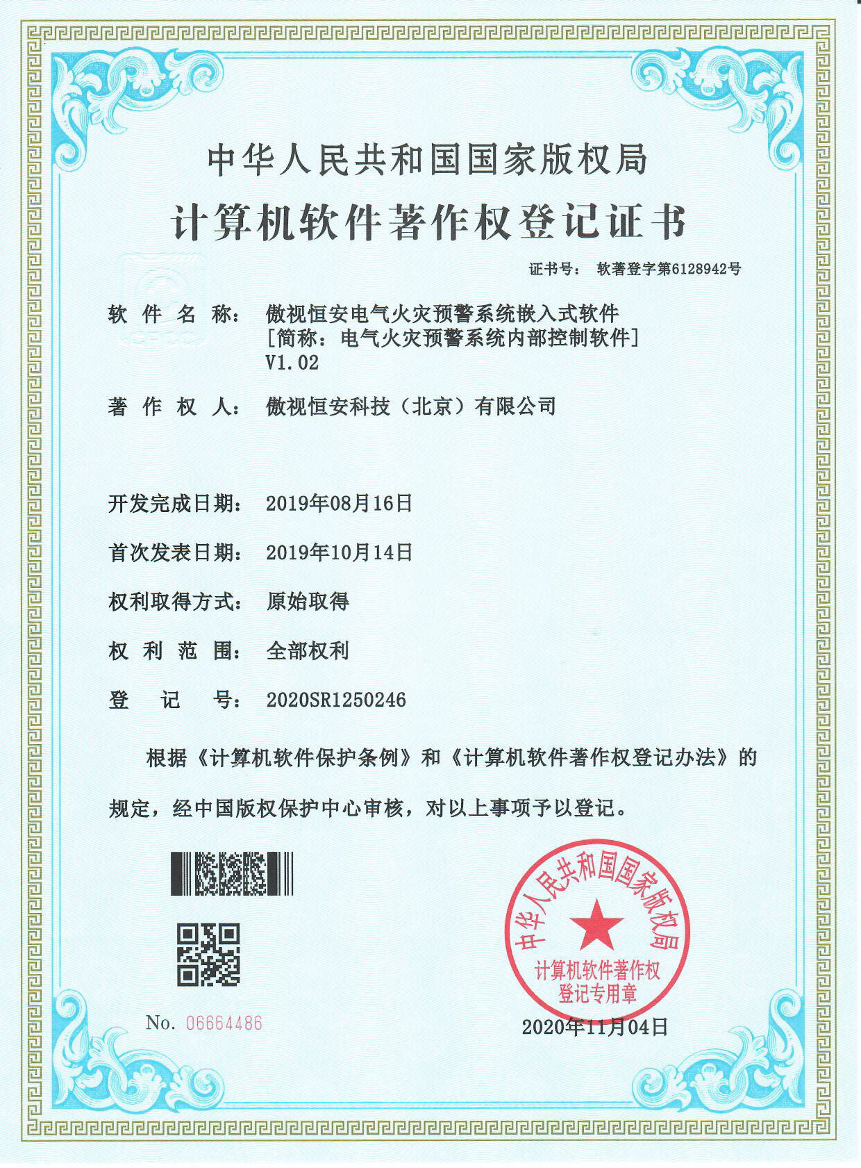 | 祝賀我公司"電氣火災預警系統嵌入式軟件"取得軟件著作自到權登記證書 |